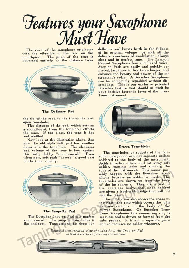 Eventually the original four Sax models were expanded to the present nine Buescher models. They simplified the key system and put on the single-acting double octave key. Last, but by no means least, Buescher perfected and patented the Snap-On-Pad.