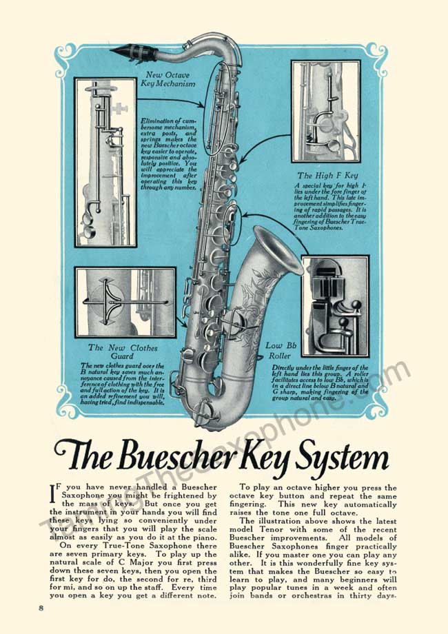 Mr. Buescher’s improvement contributions to the saxophone have been continuous and of increasing importance over a period of forty years. Today the Buescher Band Instrument Company produces the highest grade of saxophones and brass band and orchestral instruments in the world.